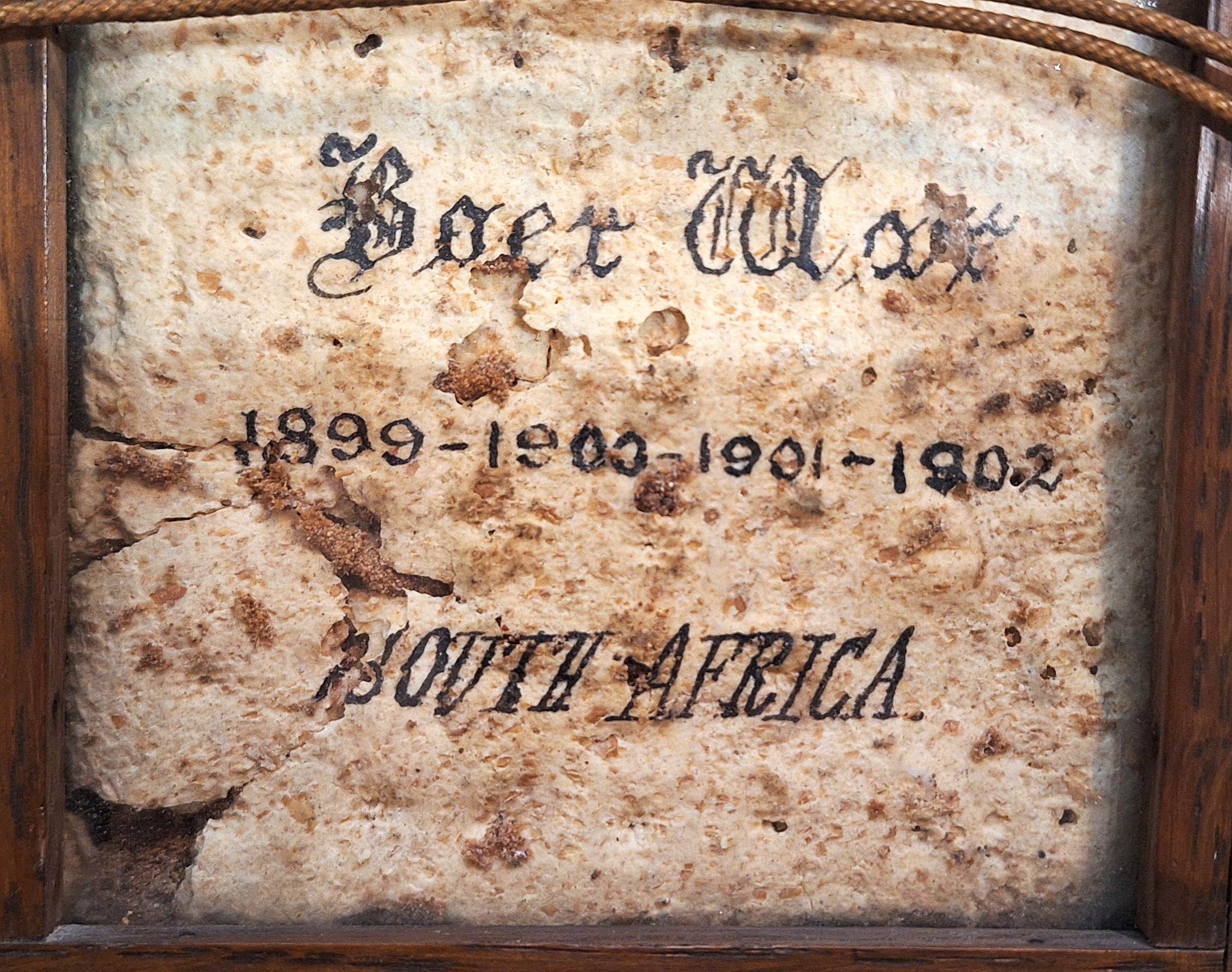 A framed biscuit from the Boer War, also known as the Second Boer War, a conflict between the British Empire and the Boer Republics between 1899 and 1902 over Britain’s influence in Southern Africa.